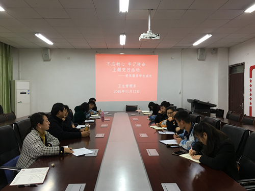 2019年11月13日下午,卫管系党支部在党员活动室A307组织召开“不忘初心、牢记使命”主题党日活动,活动主题“党员服务学生成长”。活动由党支部书记陶婷婷主持,全系党员、2019级学生代表参加活动。
